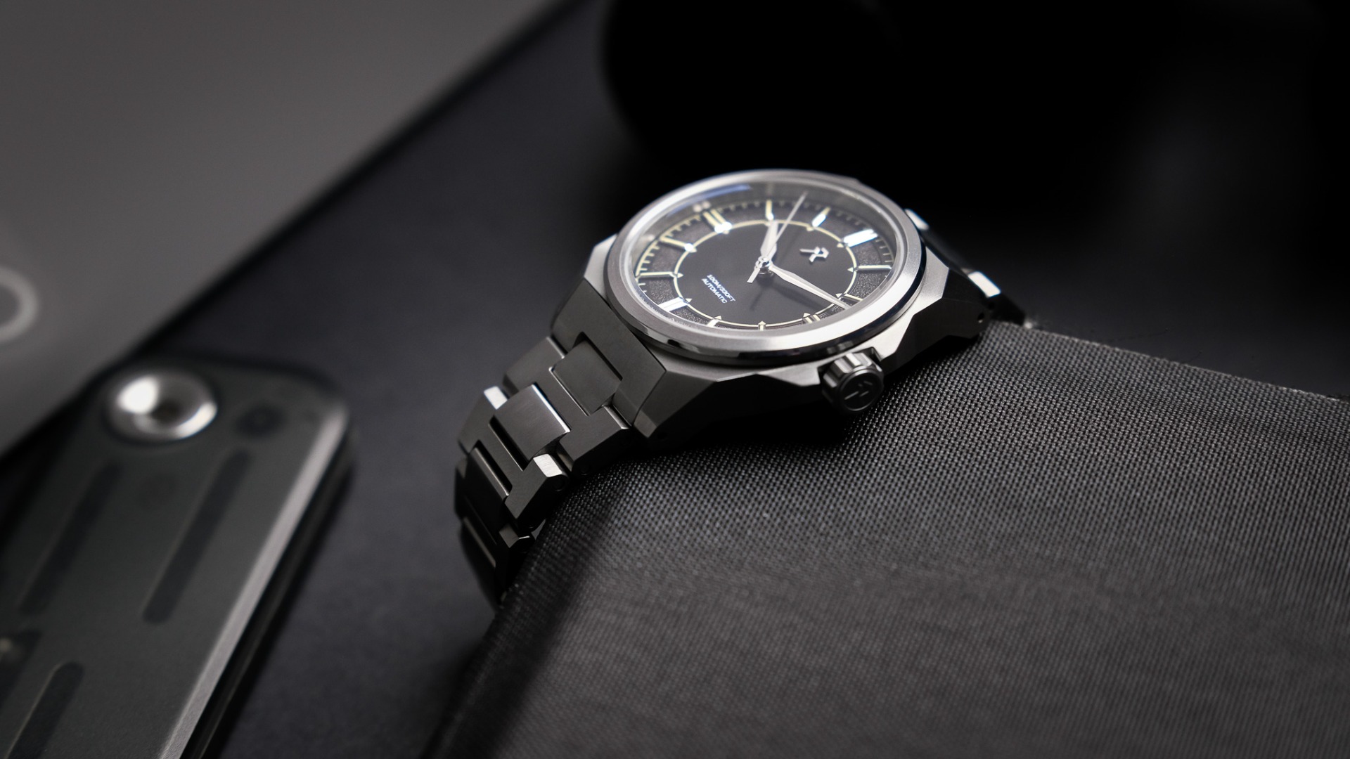 The watch and bracelet are made from Grade 2 titanium with UltraHex™ coating (1200 Hv). Lightweight, hypoallergenic, and super scratch resistant. I like to wear my watches (even if Instagram makes it look like I'm not taking any of my watches out from my studio…). UltraHex makes the surface hardness high enough that I can actually wear this thing without babying it.